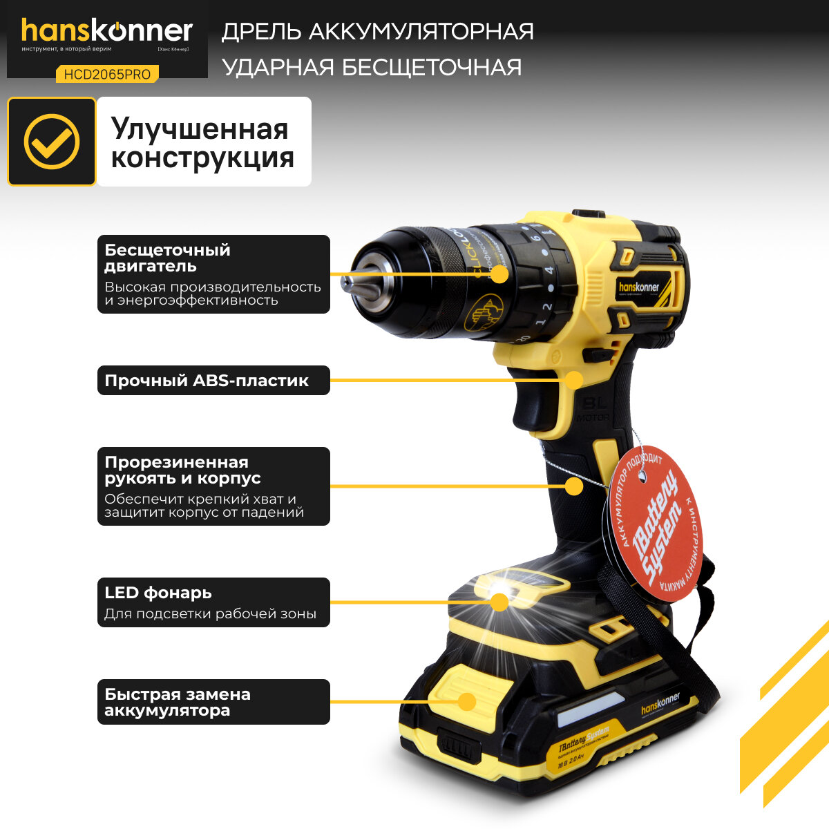 HCD2065PRO Аккумуляторный шуруповерт Hanskonner 1BatterySystem