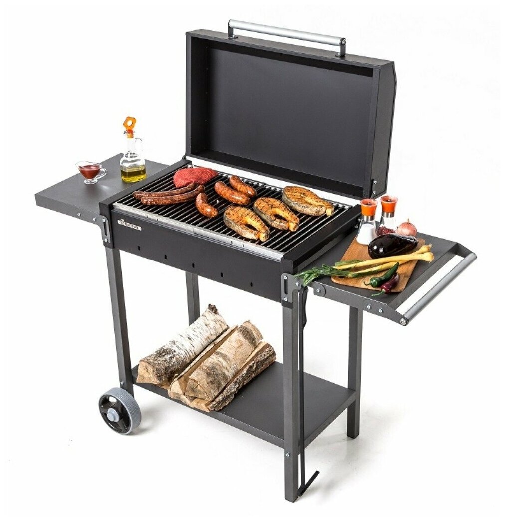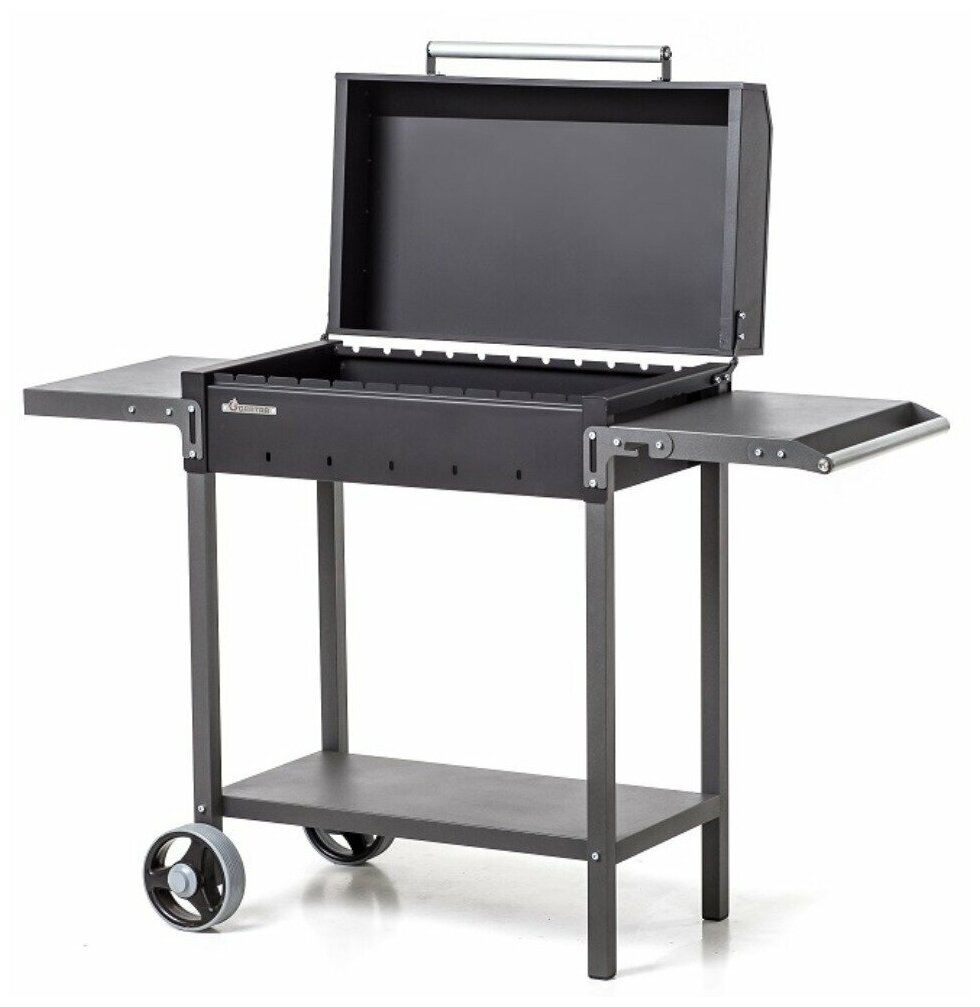 Мангал 1285х520х901 мм, 2 мм, разборный, с крышкой, гриль, BBQ, 2 полки, с колесами, Gratar, МАН 203