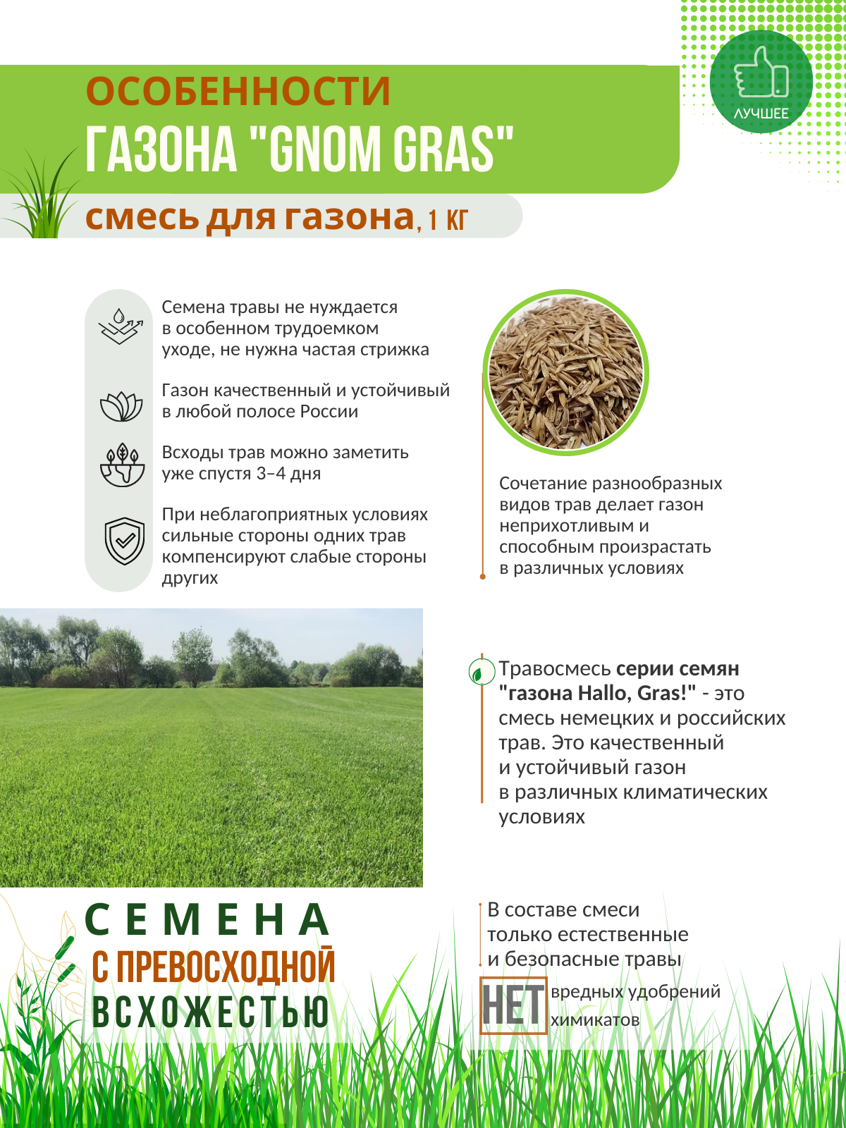 Ниже Вы можете прочитать отзывы на Травосмесь Газон Сити "GNOM GRAS" 1 кг, ознакомится с подробными характеристиками, посмотреть интересные обзоры и фотографии на Травосмесь Газон Сити "GNOM GRAS" 1 кг.