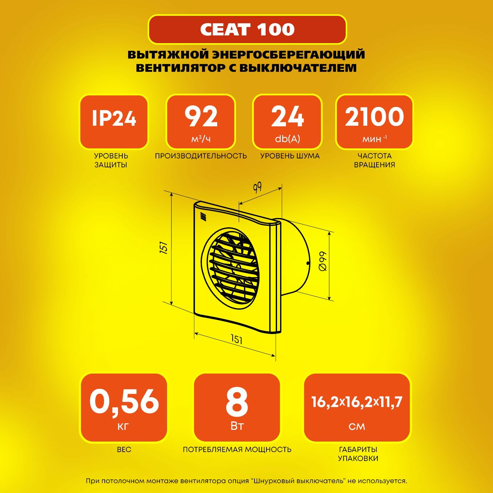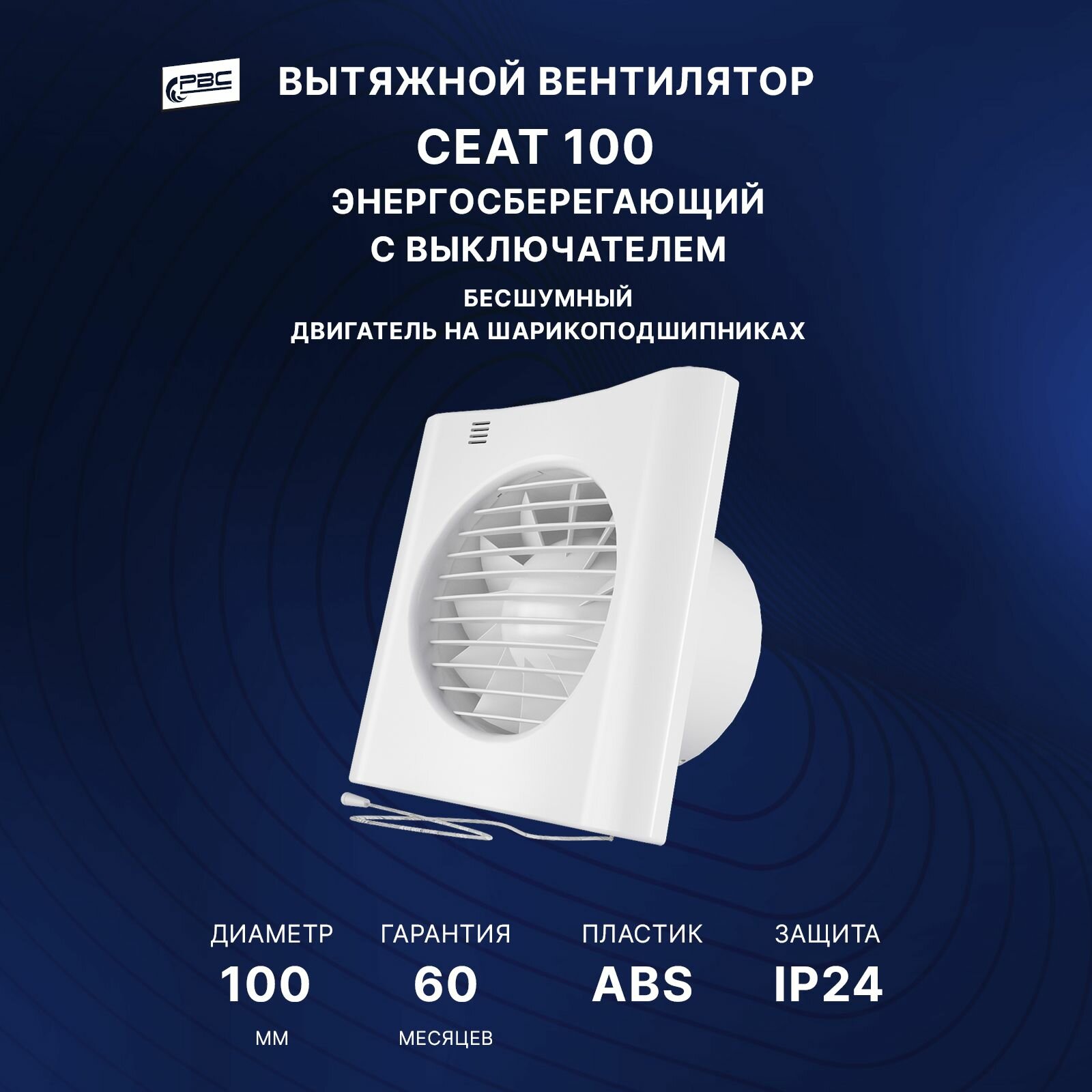 Вентилятор вытяжной с выключателем тихий и энергосберегающий РВС Сеат 100, 8 Вт, 24 дБ, 92 м3/ч