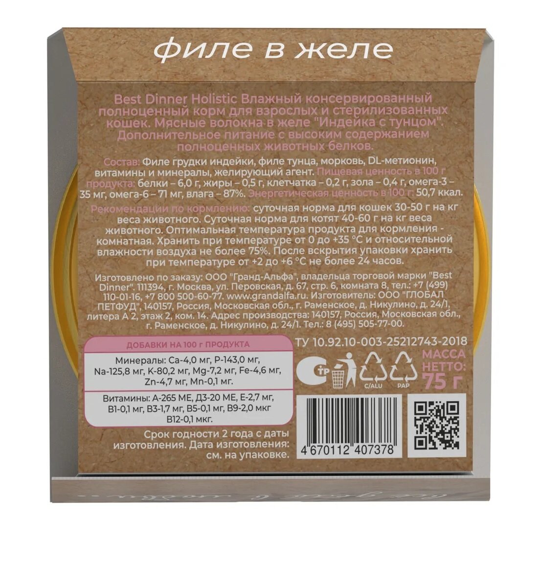 Best Dinner Holistic 0,07кг тунец с крабом в соусе для кошек 18шт/1уп