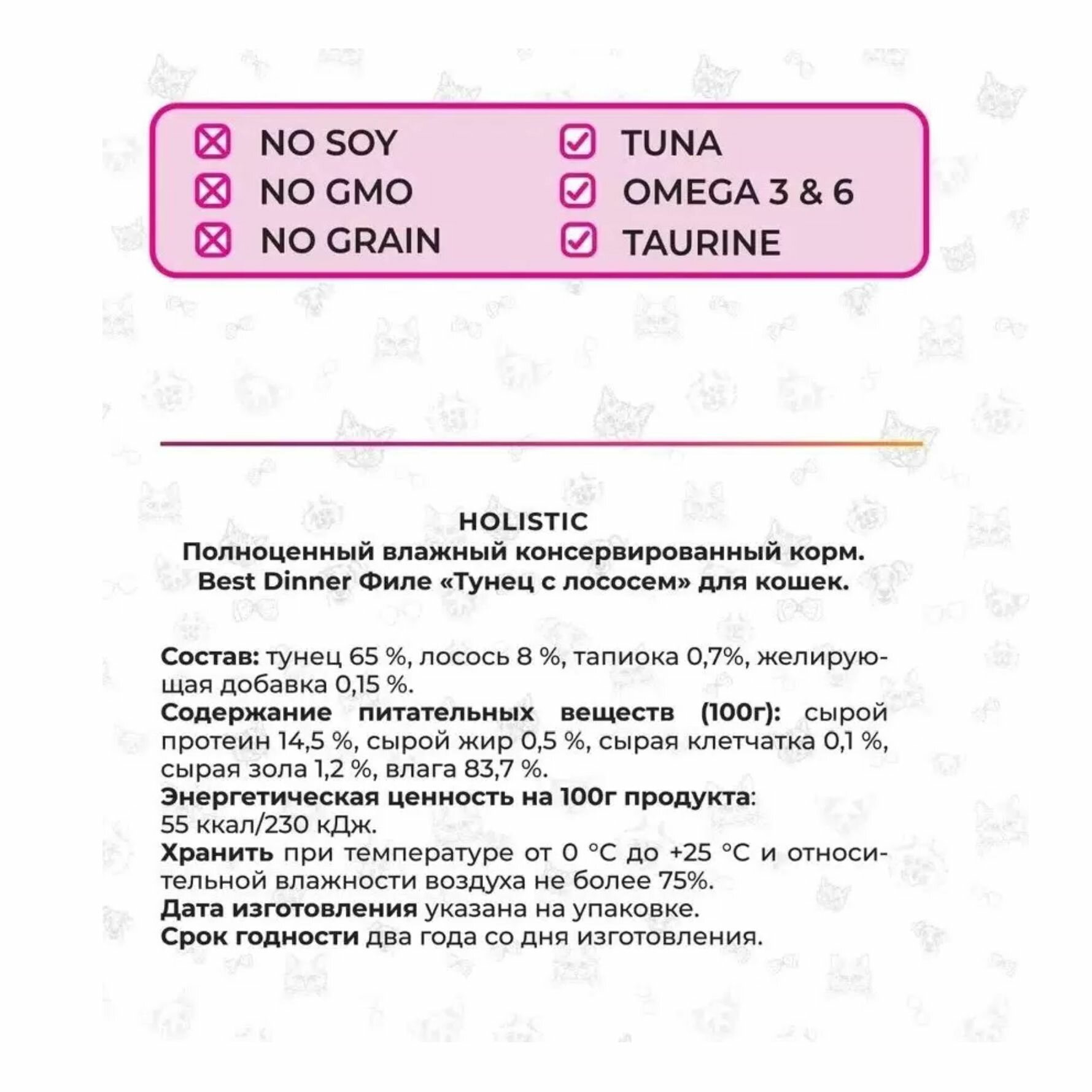 Влажный корм для кошек и котят Best Dinner Холистик Филе тунца с лососем в соусе, пауч 70 г х 9 шт Бест Диннер