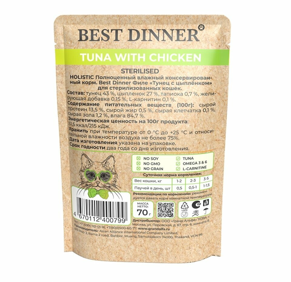 Корм влажный для кошек и котят Бест Диннер (Best DInner) Холистик мясо филе тунца с цыпленком в соусе, пауч (18шт*70гр)