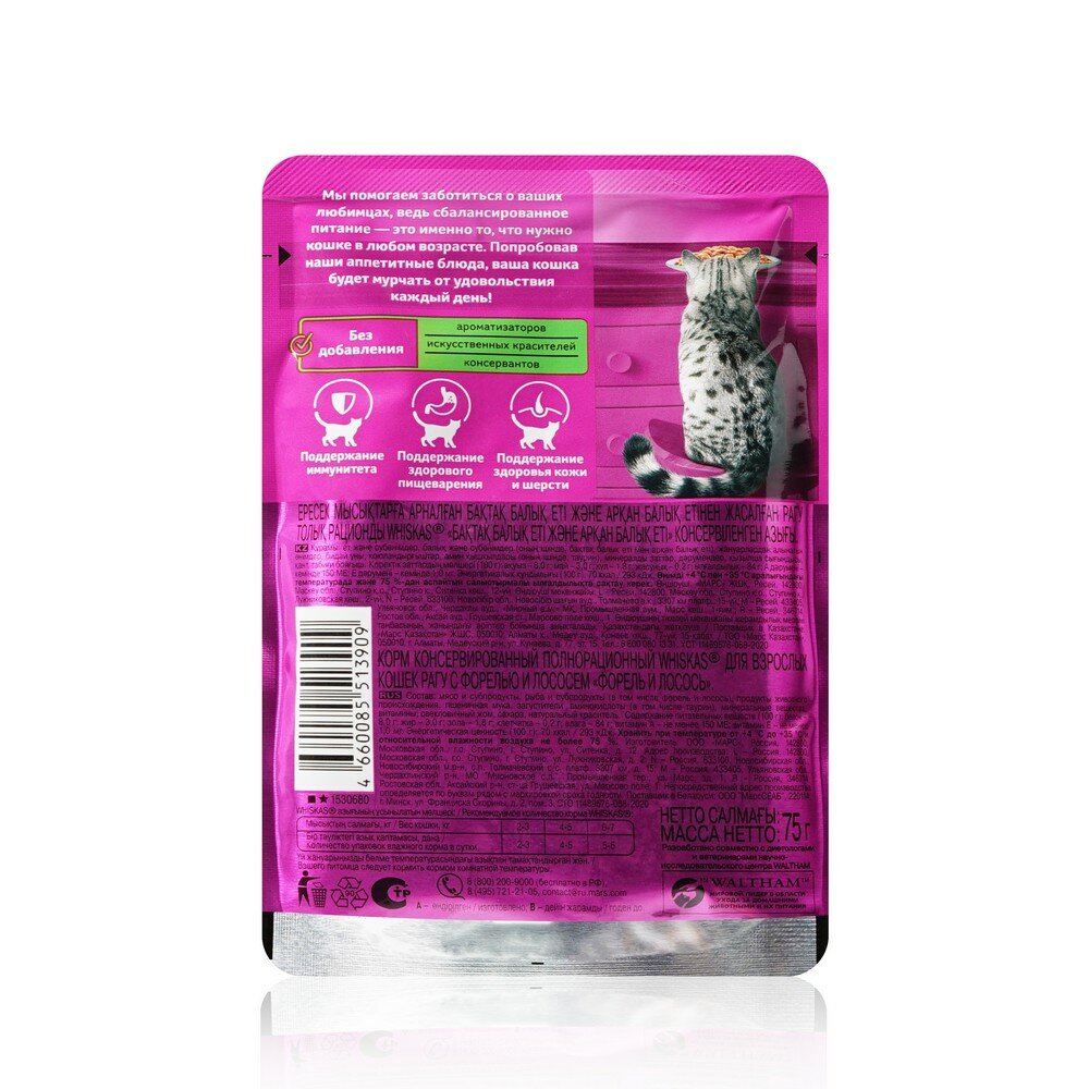 Влажный корм WHISKAS полнорационный для взрослых кошек, рагу с форелью и лососем, 75г
