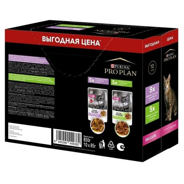 Купить Purina Pro Plan (паучи) Набор паучей для взрослых кошек с чувствительным пищеварением 10шт (индейка в соусе, ягненок в соусе) 12518365, 0,85 кг