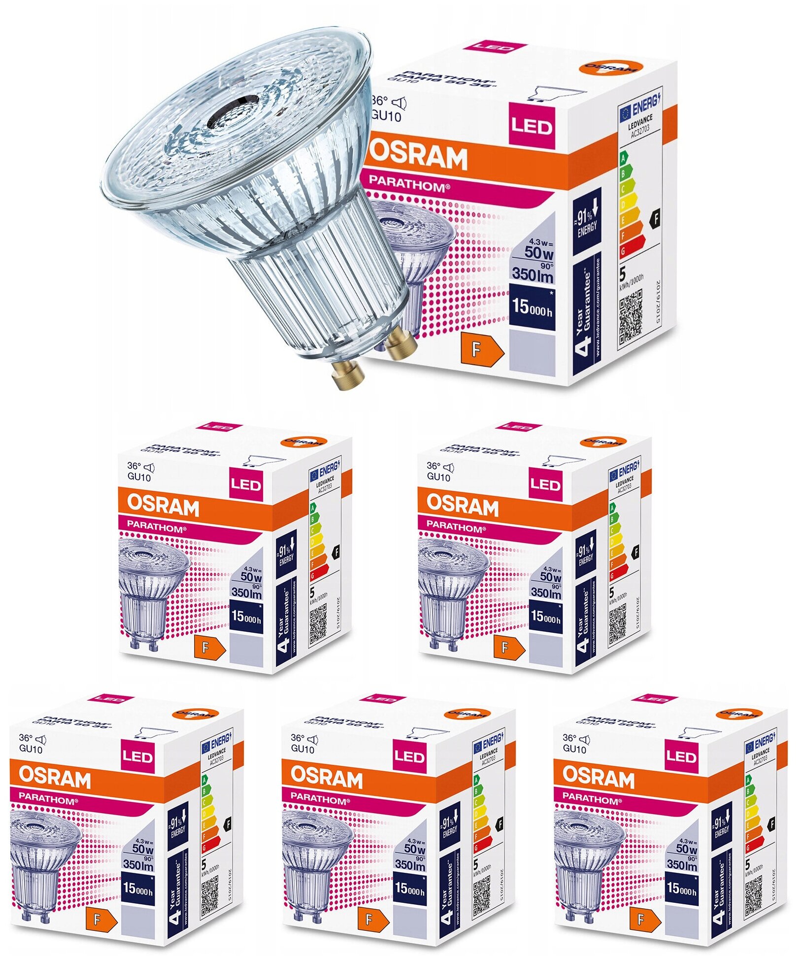 Купить 5 шт/уп. Лампа LED Софит 4.3W 220-240V GU10 PAR16 350Лм 4000К Угол 36 град. D-50mm L-52mm Свет Нейтральный белый OSRAM, уп. 5шт