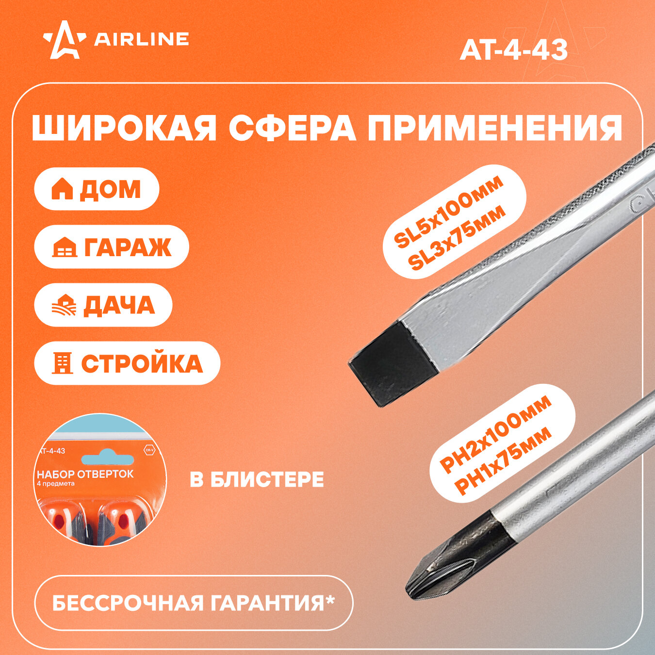 Купить Набор отверток 4 пр. (SL3х75мм,SL5х100мм,PH1х75мм, PH2х100мм), блистер AT-4-43 AIRLINE