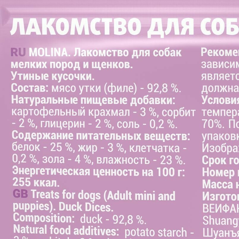 Купить MOLINA, Лакомство для собак мелких пород и щенков, Утиные кусочки, 50 г