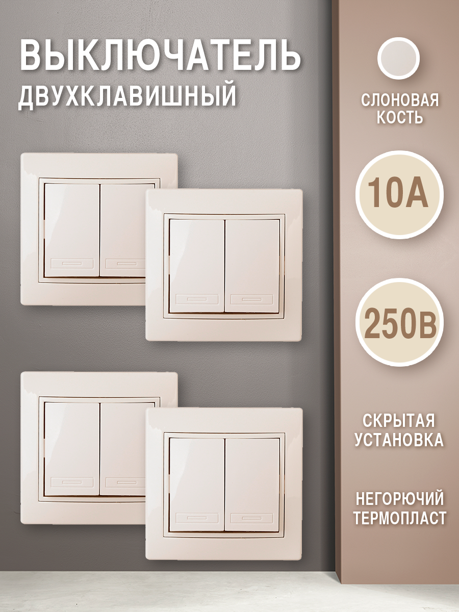 Купить Выключатель двухклавишный (комплект 4 шт.), 10А-250В, IP20, СУ, слоновая кость