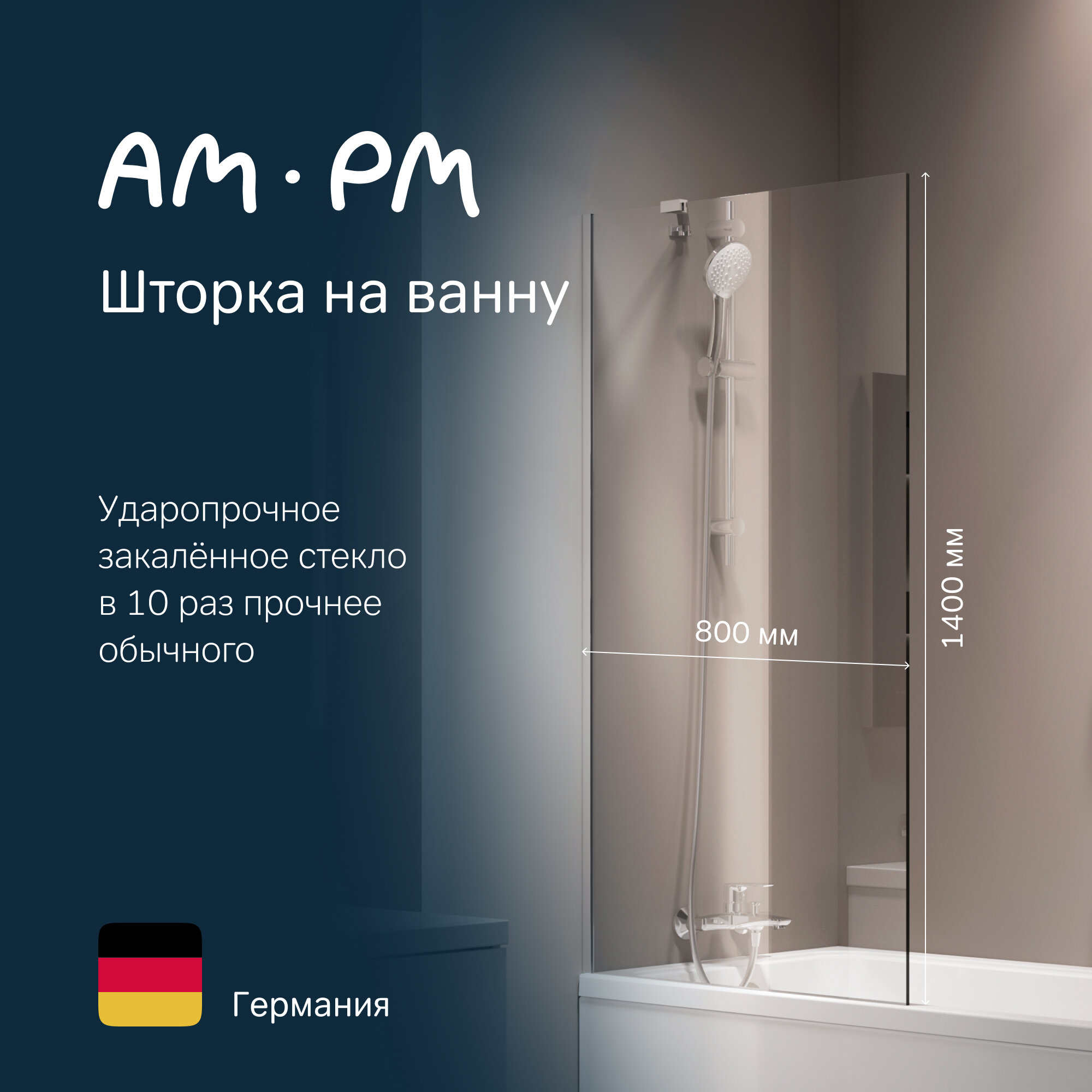 Стеклянная шторка для ванной AM.PM Gem W90BS-080-140CT 80х140 ширма на ванну, профиль хром, стекло прозрачное, гарантия 3 года, Германия