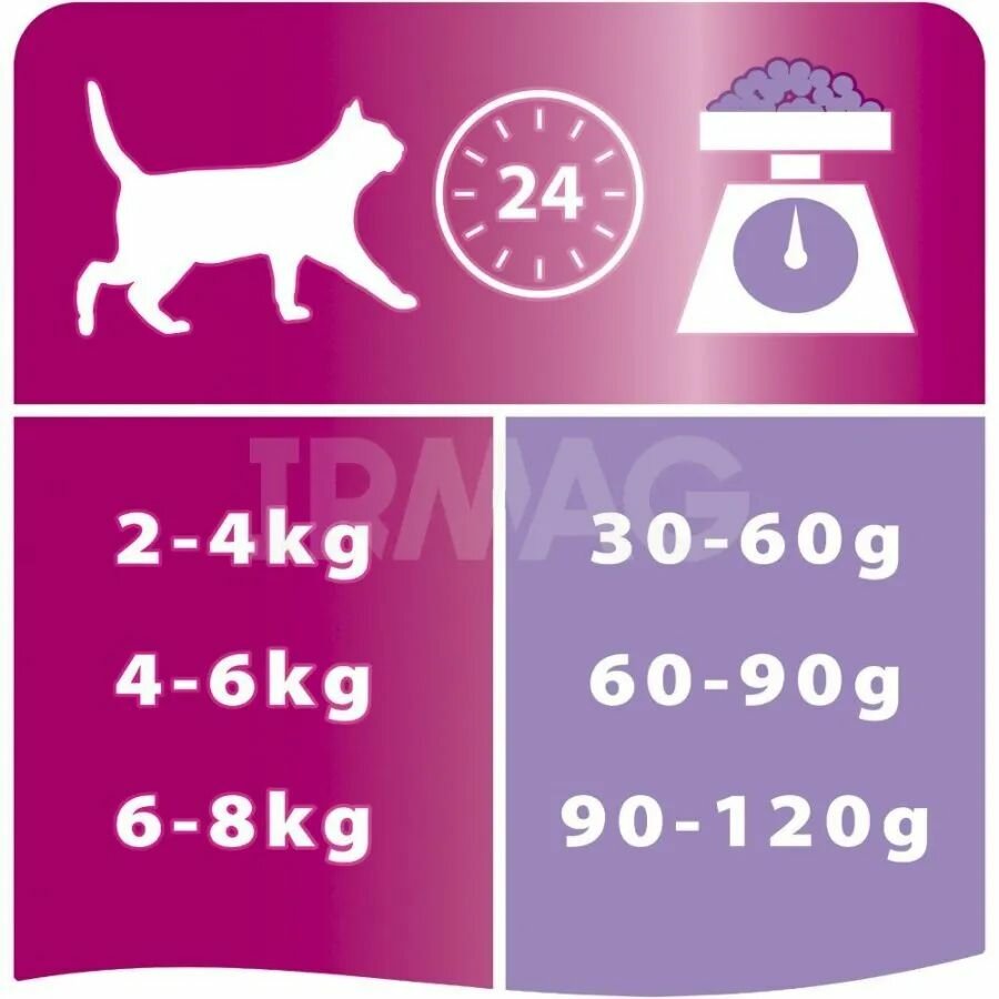 | Дополнительная информация | рекомендации по кормлению, позволяющие поддерживать идеальную форму могут варьироваться в зависимости от возраста животного, его активности и условий окружающей среды; следите за весом Вашей кошки и корректируйте количество даваемого корма; следите, чтобы у Вашей кошки всегда была чистая, свежая питьевая вода; для здоровья Вашей кошки регулярно консультируйтесь с ветеринарным врачом |