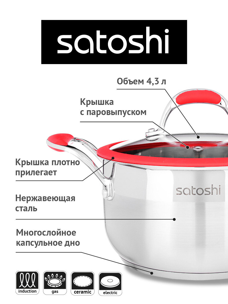 Купить Кастрюля Satoshi Венрай, 4,3 л, со стеклянной крышкой, нержавеющая сталь, индукция