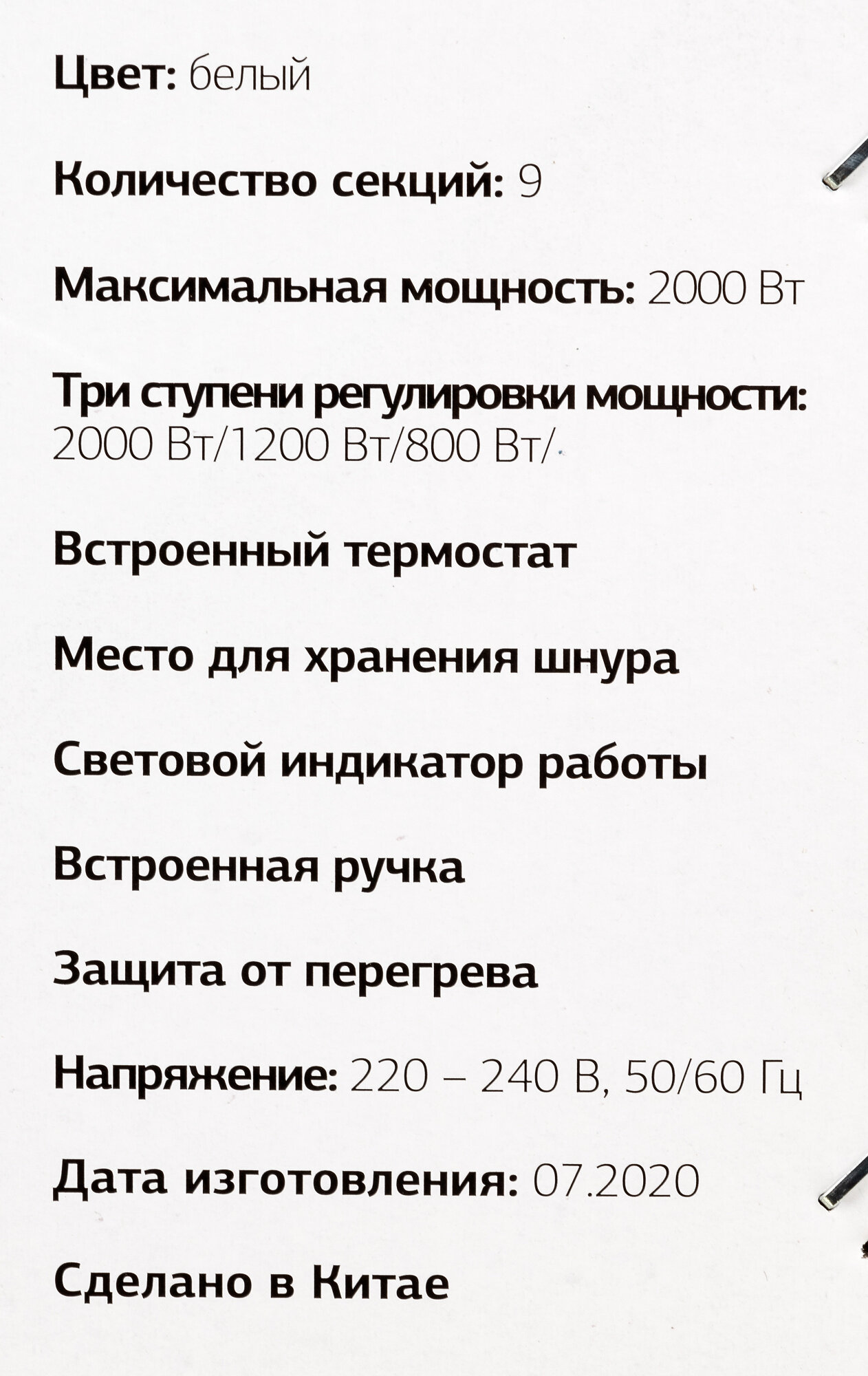 Масляный радиатор StarWind SHV6915, с терморегулятором, 2000Вт, 9 секций, 3 режима, белый