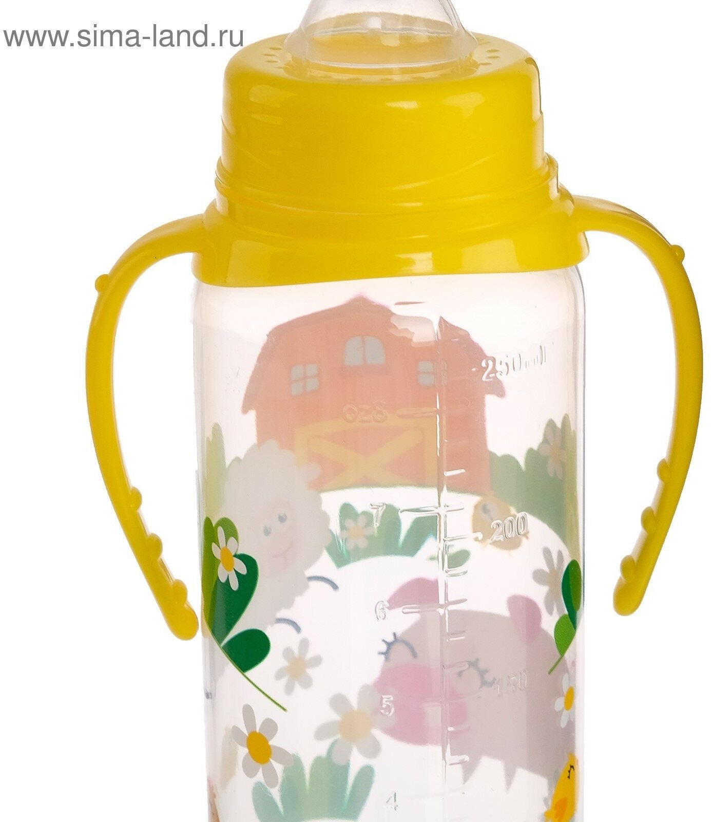 Бутылочка для кормления «Весёлая ферма», классическое горло, с ручками, 250 мл., от 0 мес, цвет жёлтый