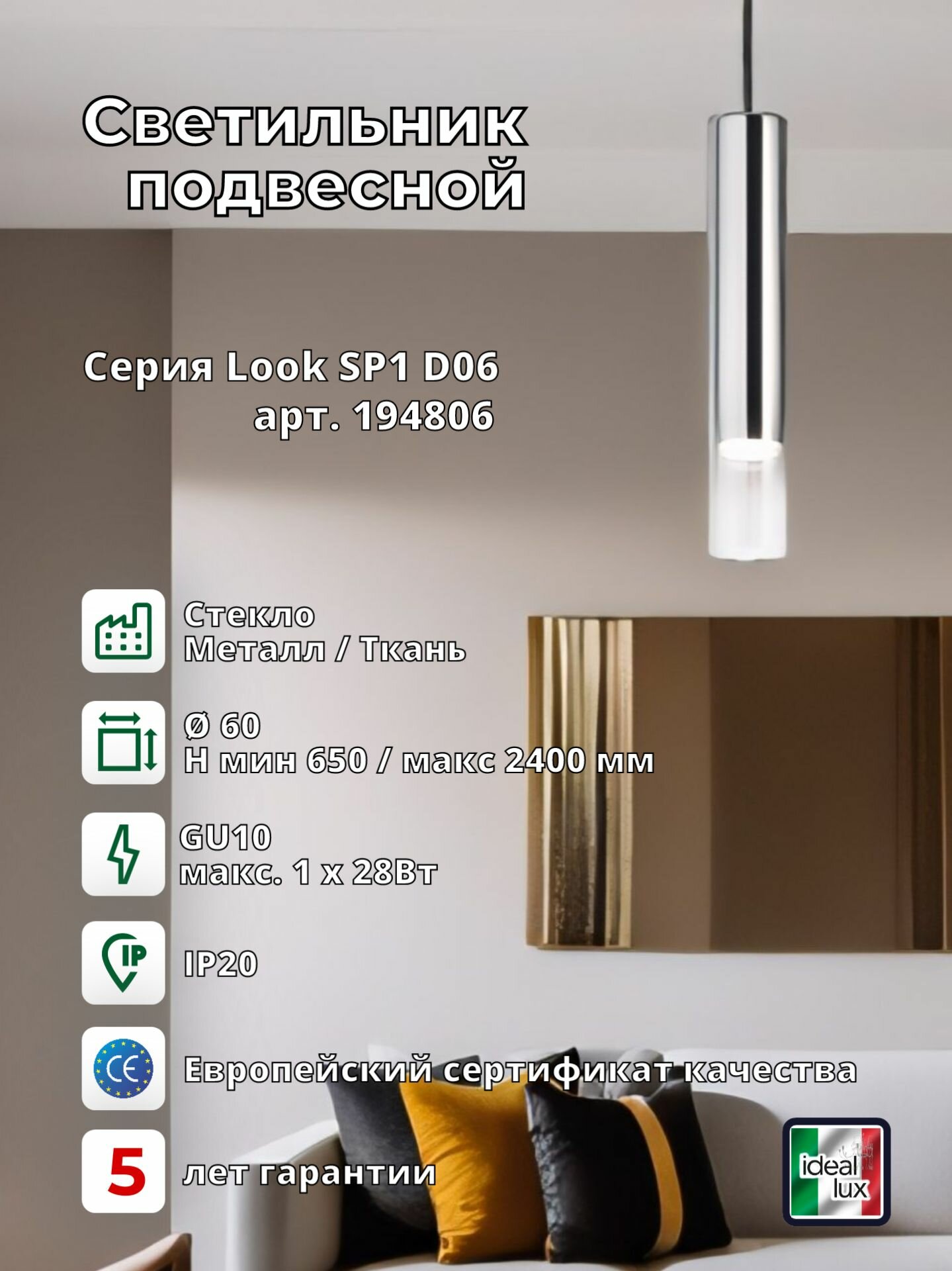 Светильник подвесной ideal lux Look SP1 D06 макс.1x28Вт IP20 GU10 230В Хром Металл 104942.