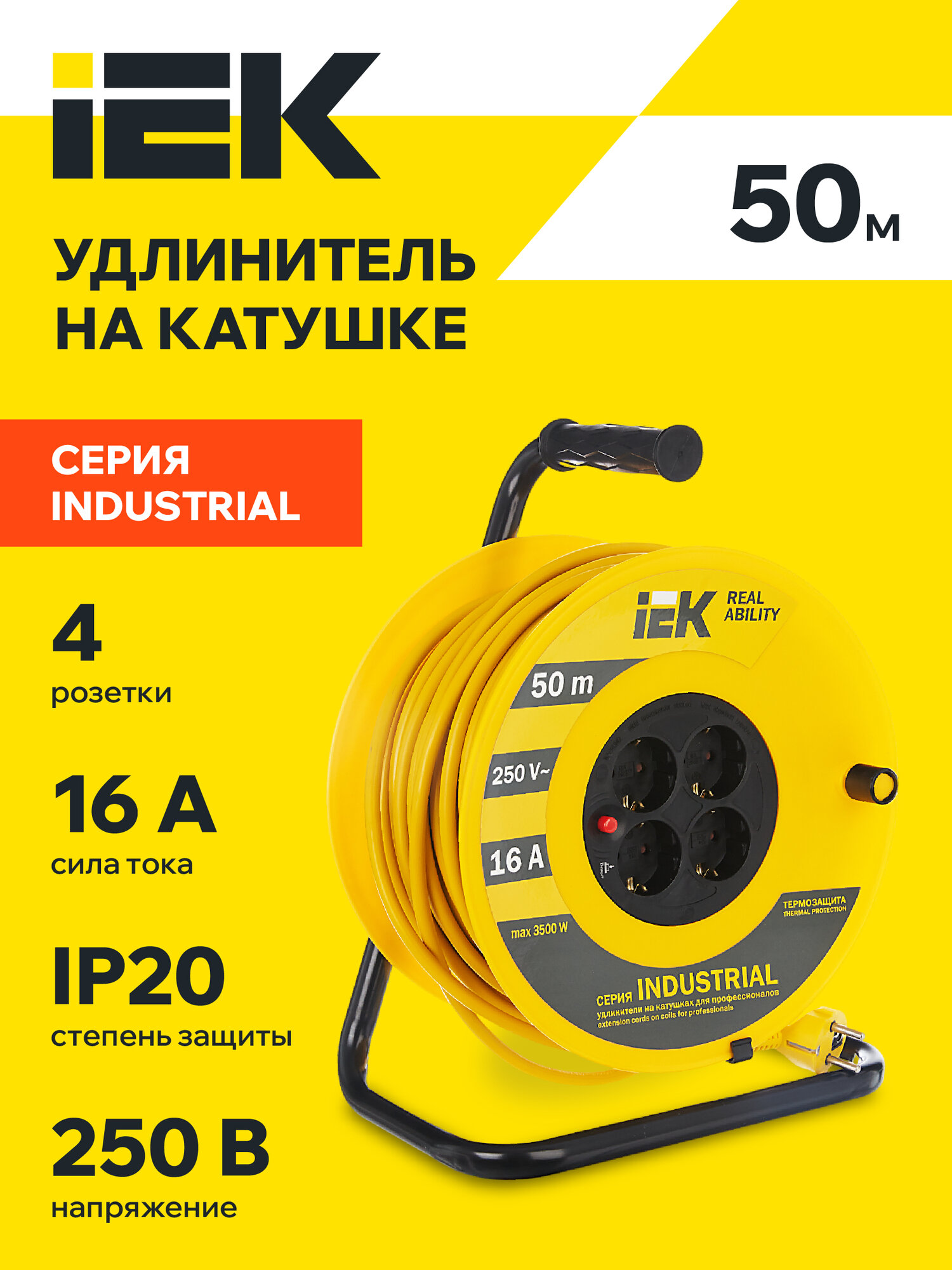 IEK Катушка УК50 с термозащитой 4 места 2Р+PЕ/50метров 3х1,5 мм2 Industrial WKP15-16-04-50