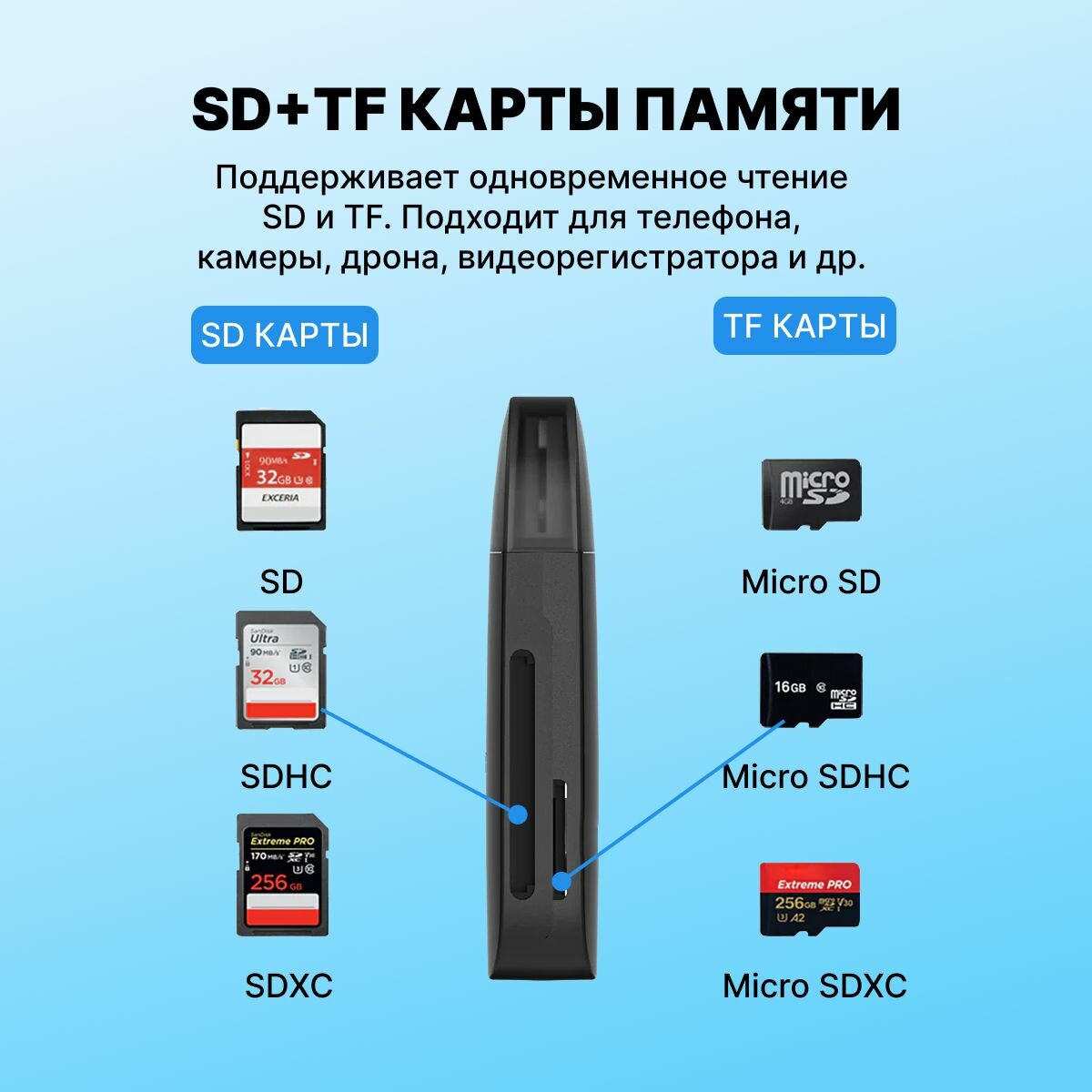 Vention Кардридер на 2 порта (SD+TF) USB 3.0, устройство для чтения карт памяти, арт. CLGB0