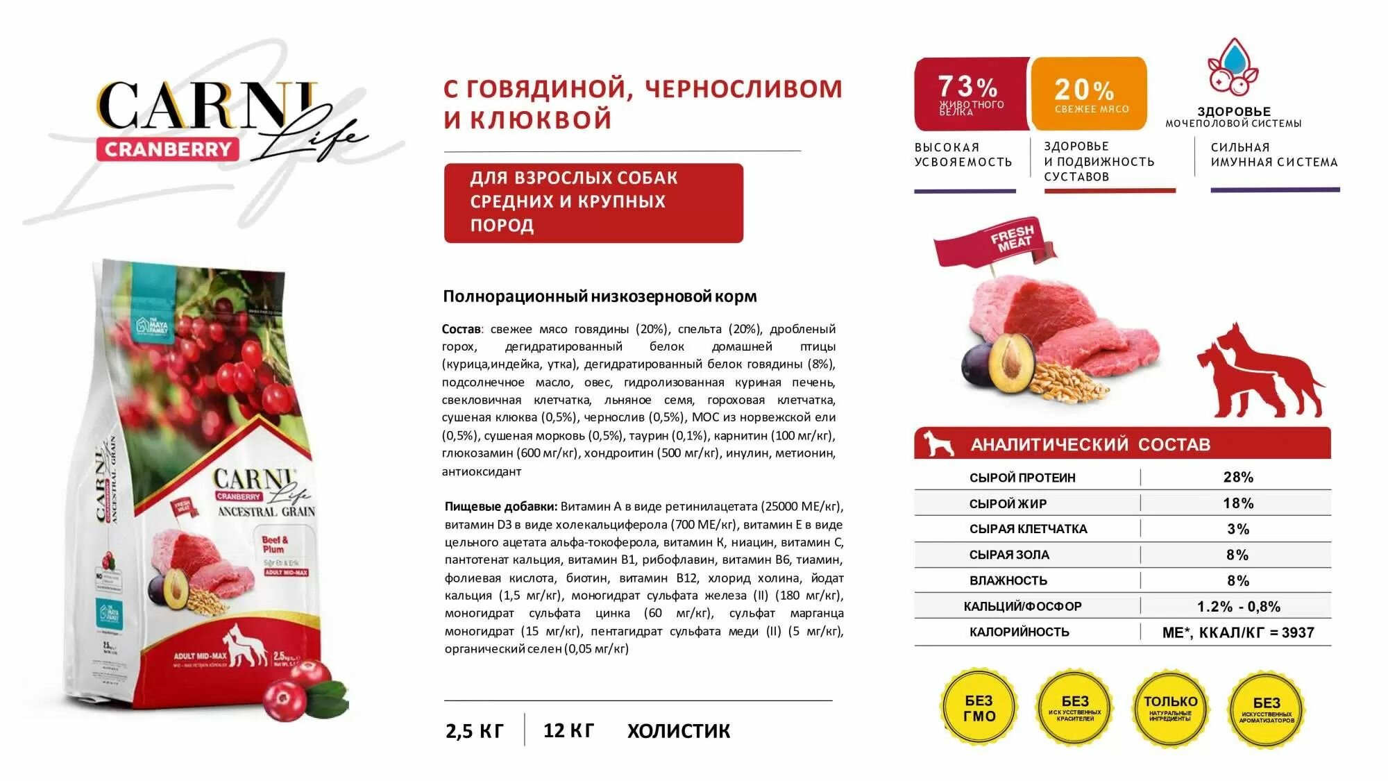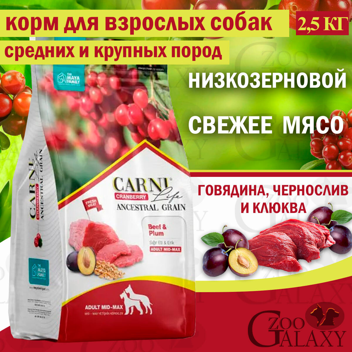 Сухой корм Carni Life Medium/Maxi (Карни) для взрослых собак средних и крупных пород, говядина с черносливом и клюквой, 2,5 кг