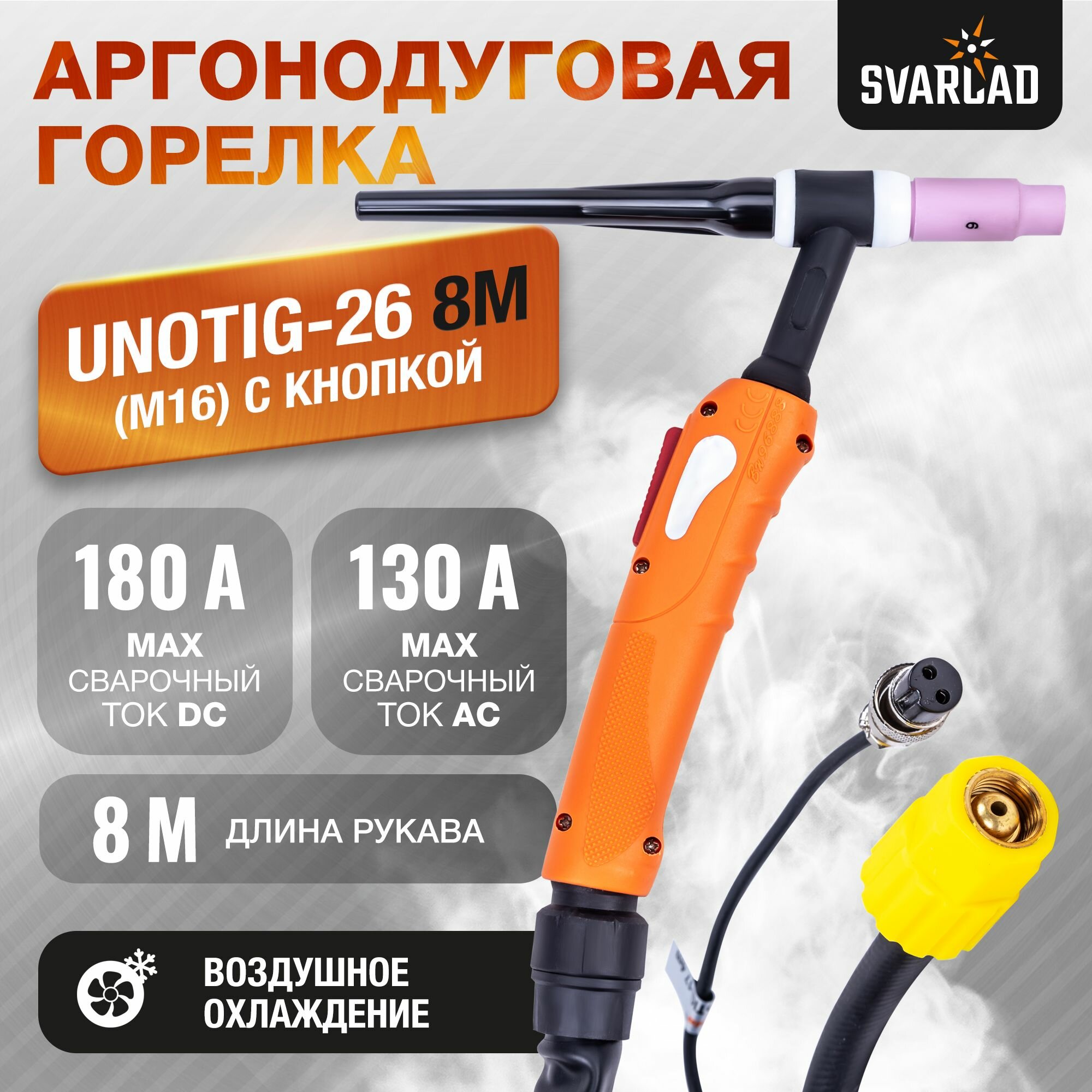 Горелка сварочная TIG-26 / UNOTIG-26 / 8 Метров / разъем М16 / с кнопокой для аргонно-дуговой сварки / воздушное охлаждения / FoxWeld