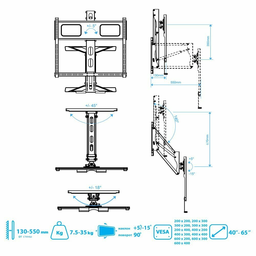 -регулировка по высоте в широком диапазоне -чуть ли не единственный кронштейн с возможностью вертикального перемещения телевизора 65 дюймов за разумные деньги |