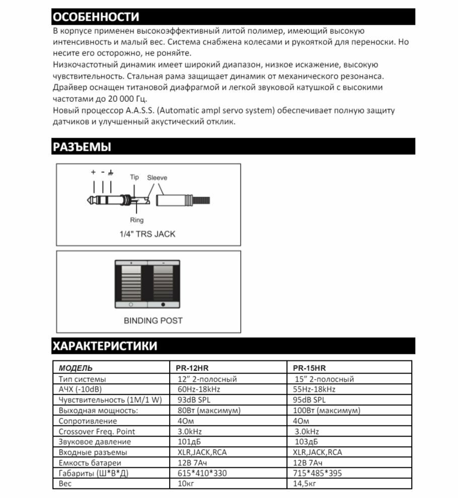 | Дополнительная информация | ВЧ драйвер: 1", компрессионный. Кроссовер: 2,5кГц. Входные разъемы: RCA, 1/4". |