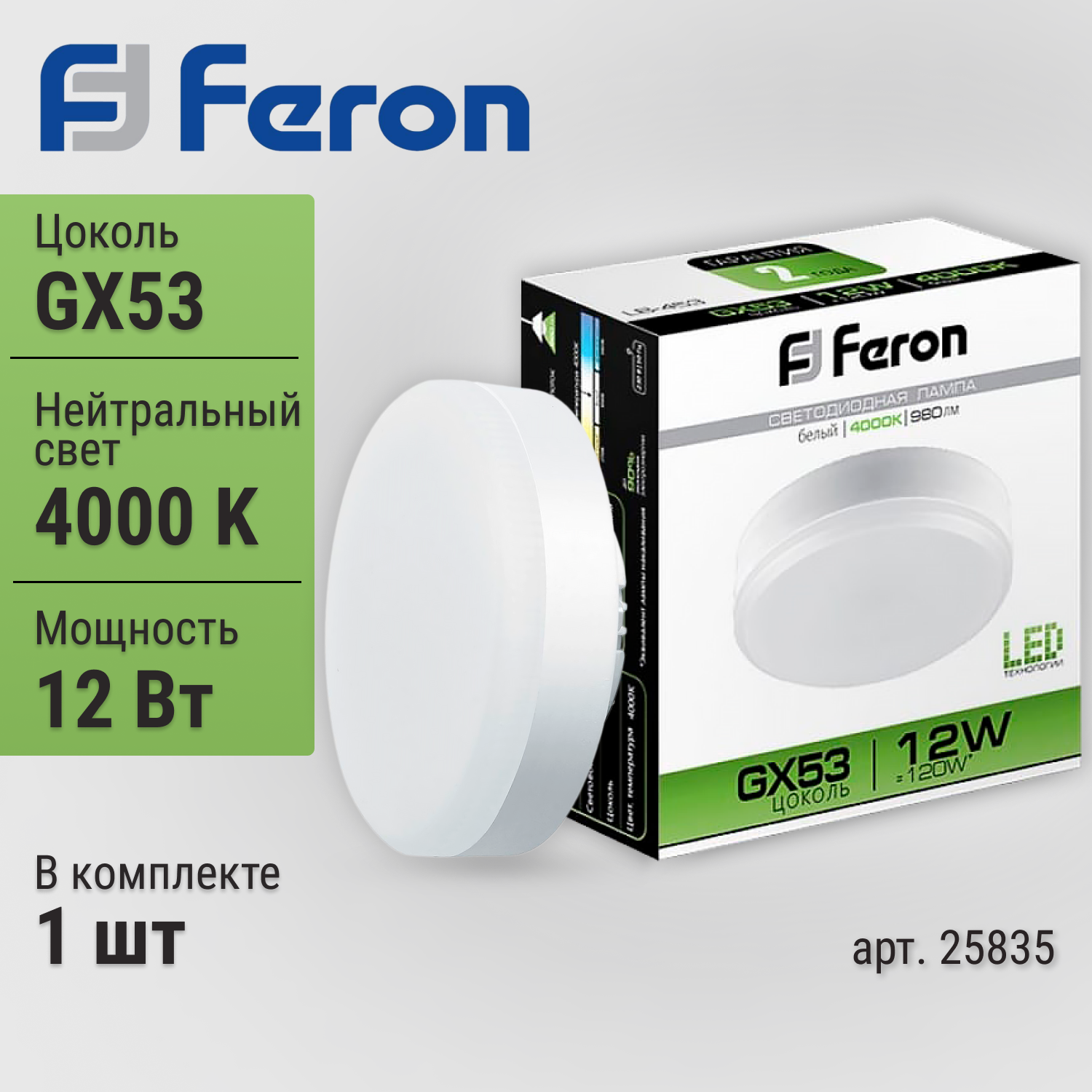 Лампа светодиодная GX53 Feron Таблетка, 12Вт, 6400К, лампочка 1 шт. 25868