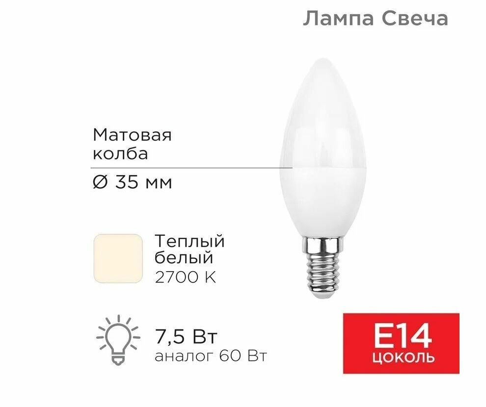 Лампа светодиодная REXANT 604-017 / 604-019, E14, 7.5 Вт, 2700 К