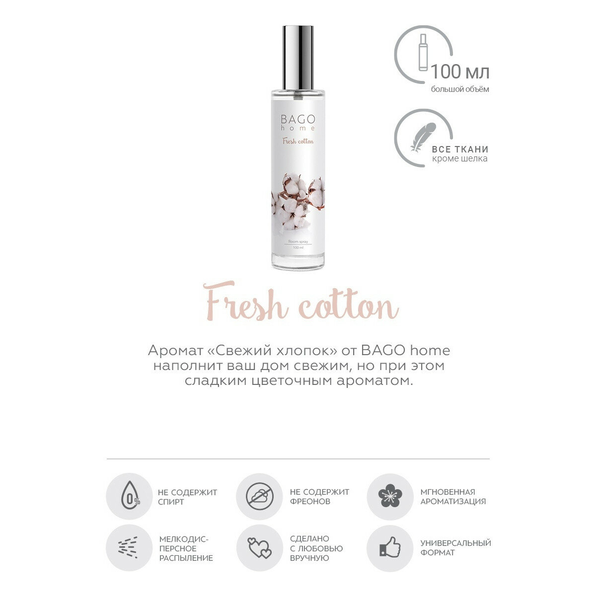 Спрей ароматический для дома BAGO home Свежий хлопок 100 мл интересное: