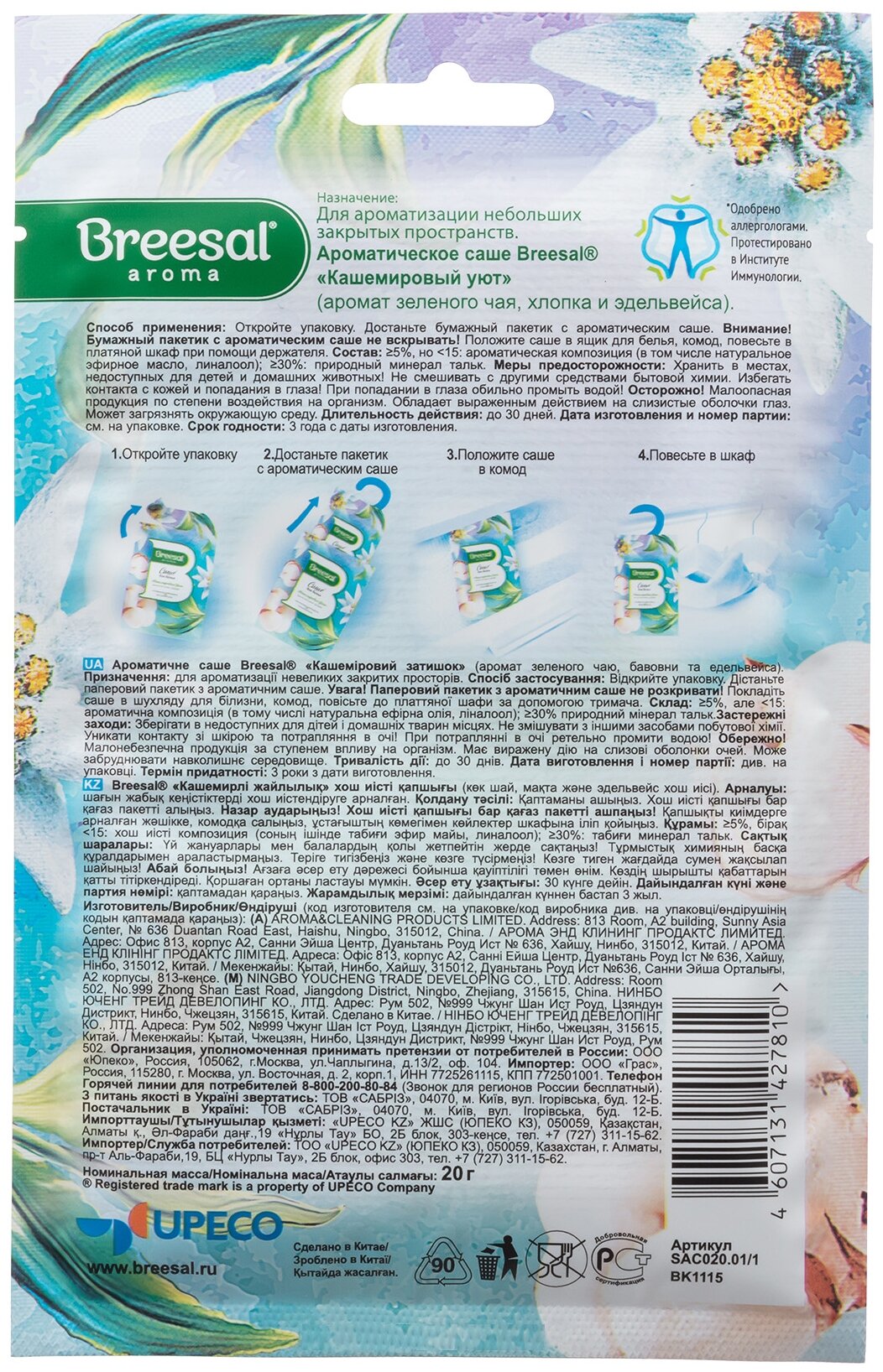 BREESAL Ароматическое саше Кашемировый уют Comfort интересное: