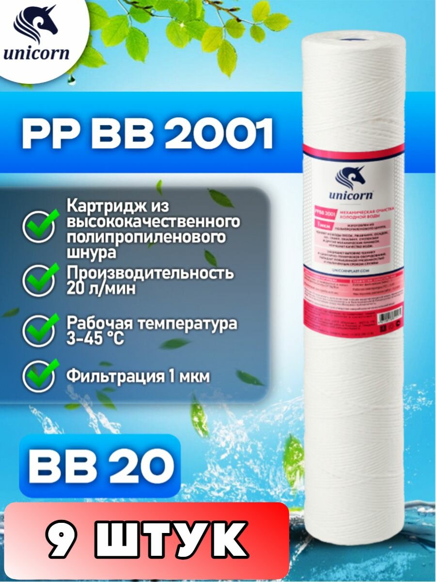 Картридж для фильтра воды механическая очистка из полипропиленового шнура для холодной воды типоразмер 20"ВВ (Big Blue) фильтрация 20 микрон Unicorn PPBB2020 9 штук (одна коробка)