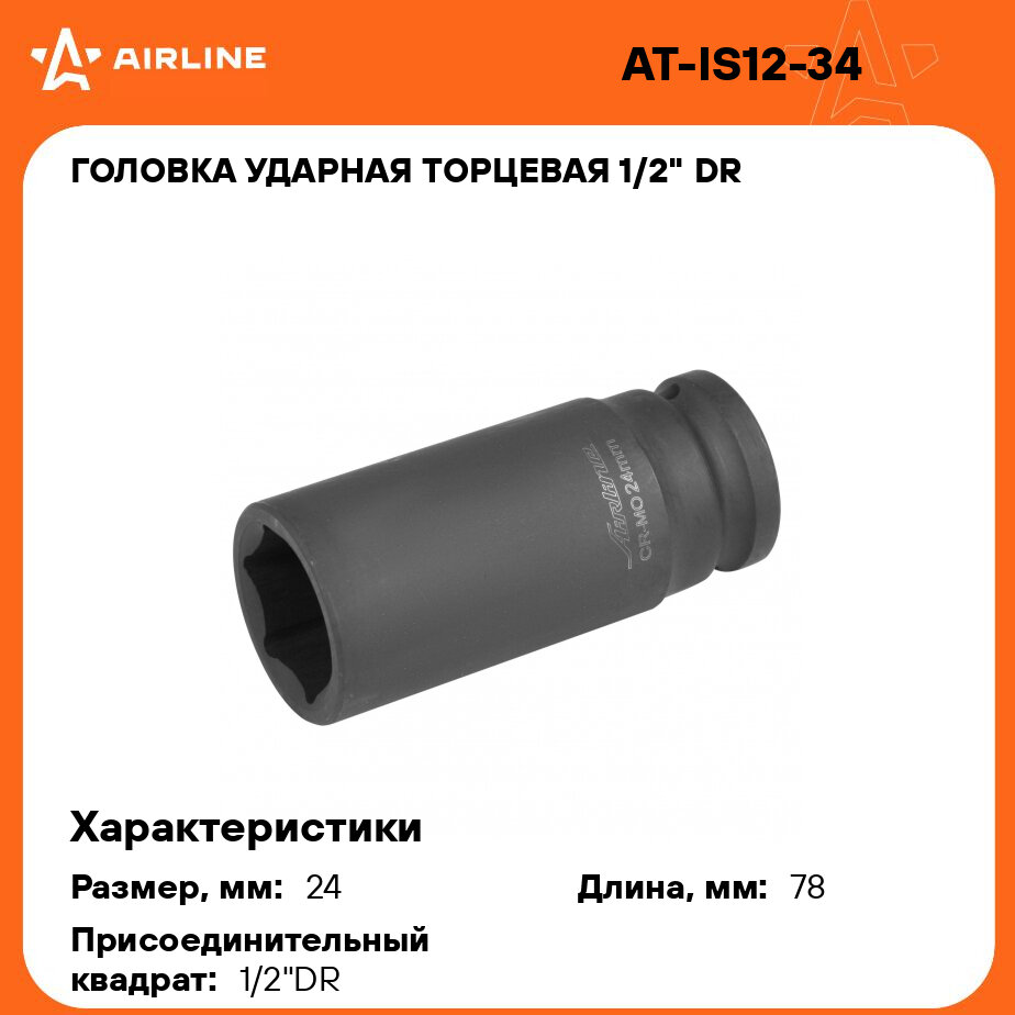 Купить Головка ударная торцевая 1/2" DR шестигранная 24мм L=78 мм AT-IS12-34 AIRLINE