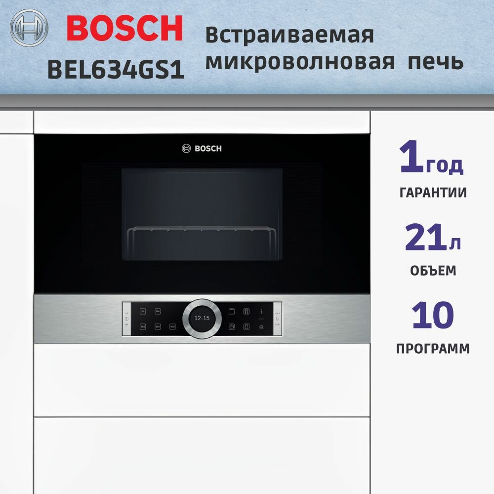 Купить Встраиваемая микроволновая печь (СВЧ) Bosch BEL634GS1 нержавеющая сталь, объем 21л., мощность микроволн 900Вт, покрытие камеры нержавеющая сталь, кварцевый гриль