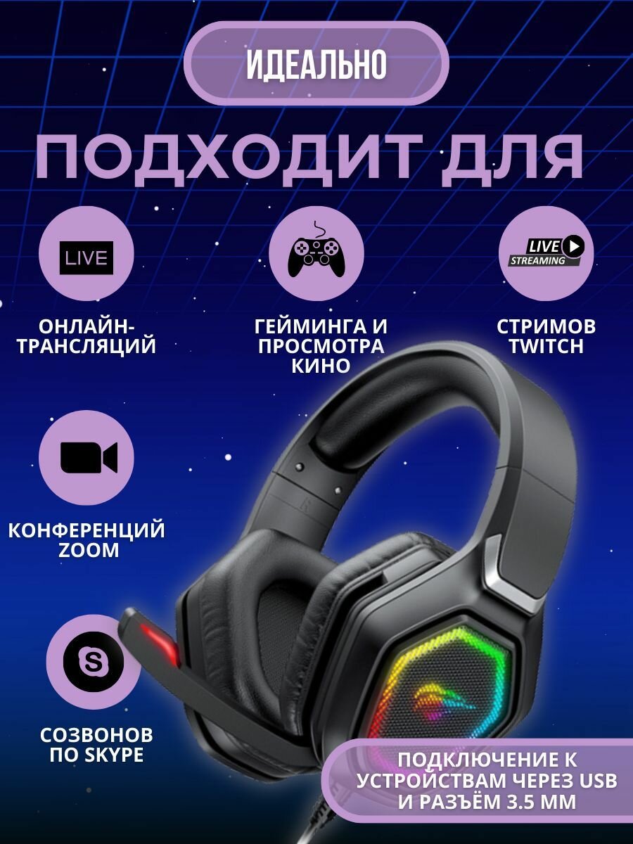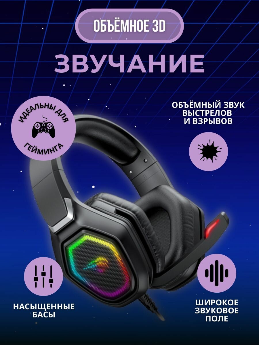 Проводные игровые (геймерские) наушники Havit H659d накладные для компьютера с микрофоном черные, RGB подсветка