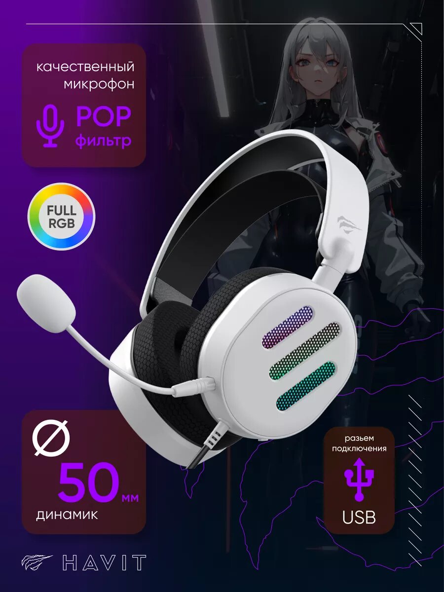 Наушники геймерские, игровые, проводные с микрофоном Havit H2002d белый/фиолетовый 3.5 jack