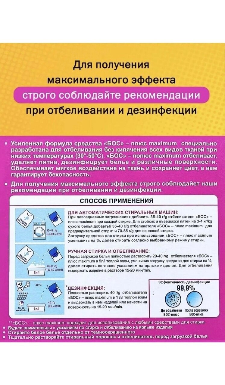 Мне очень нравится это средство, отлично отбеливает. В очень горячей воде растворяю бос, замачиваю белое бельё примерно на час, затем стираю при 60 градусах, результат ??намного лучше дорогостоящих отбеливатель |