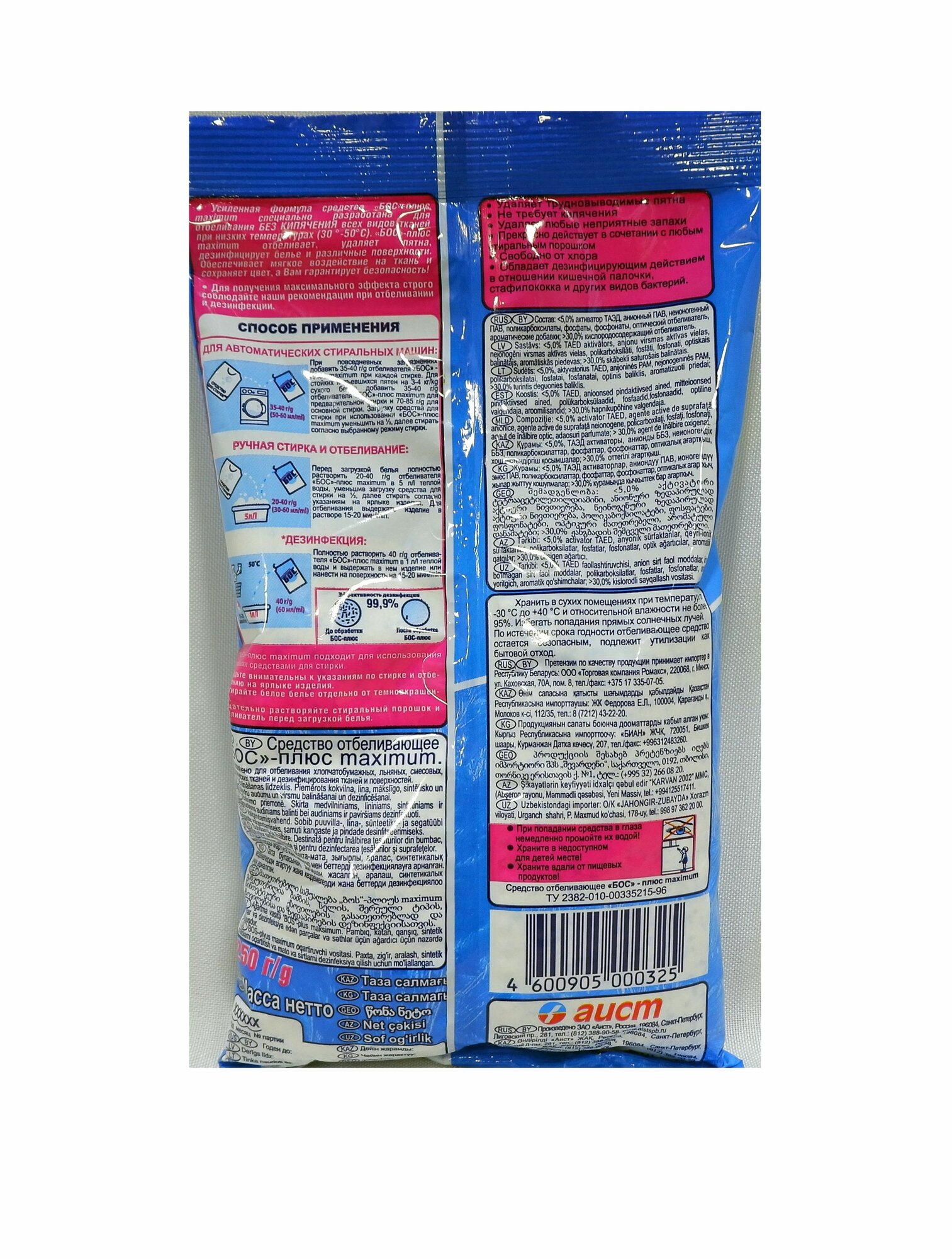 | Отзыв: | быстро отбеливать сохраняет цвета ткань усиливает действие средство для стирки трудновыводимые пятна странной формы средство бос плюс максимум и специально разработана для отбеливания без кипячения всех видов тканей при низких температурах + Maximus отбеливают и уделяет пятна |