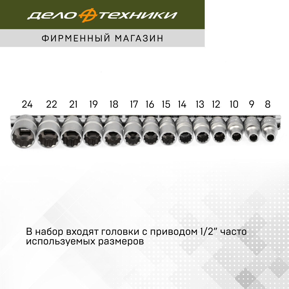 Набор головок 12-ти гранных 1/2 14 пр.(8 9 10 12 13 14 15 16 17 18 19 21 22 24 мм) дело техники Артикул: 622114