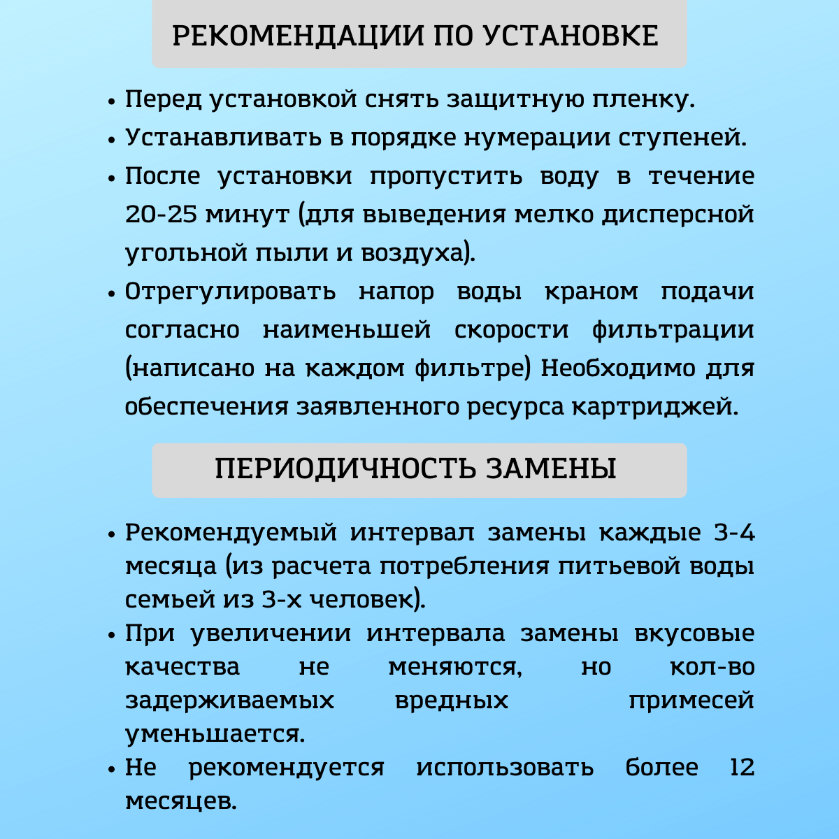 | Дополнительная информация | Только для водопроводной воды, ресурс зависит от степени загрязненности воды. |
