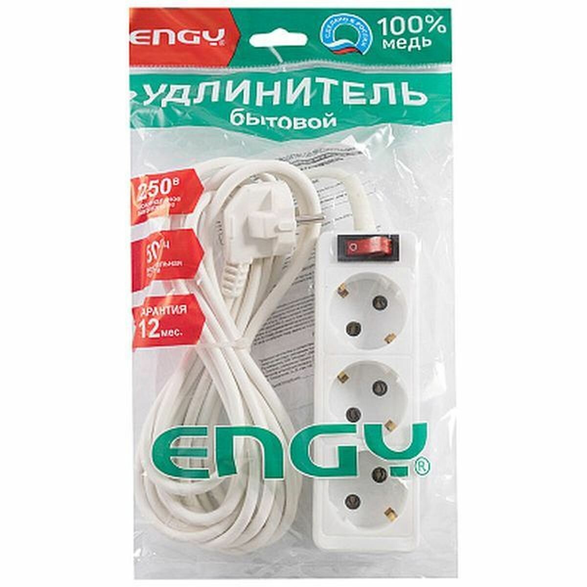Удлинитель с выключателем Engy Гранд, ПВС 3 x 0,75 мм, с заземлением, 3 розетки, 5 м, белый