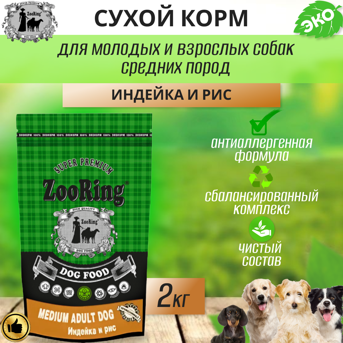 Сухой корм для собак ZooRing телятина, с рисом 2 кг (для средних пород)