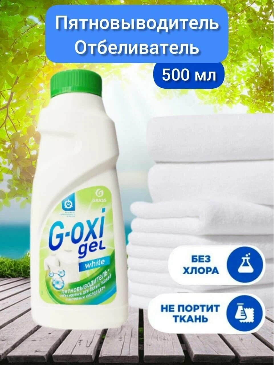 GRASS G-oxi Gel. Пятновыводитель-отбеливатель для белых тканей. Усиливает белизну. От пятен травы, вина, сока, шоколада. 500 мл