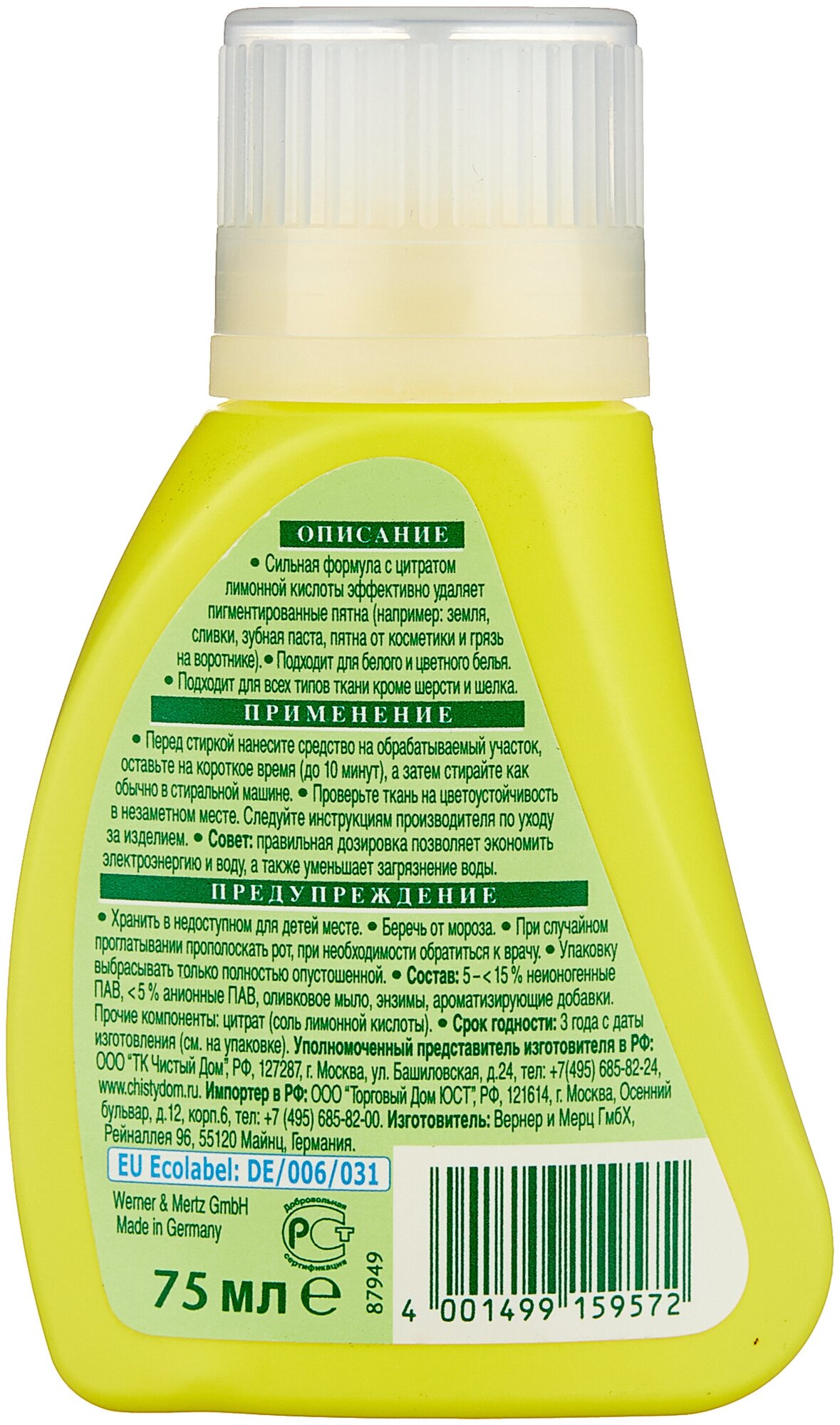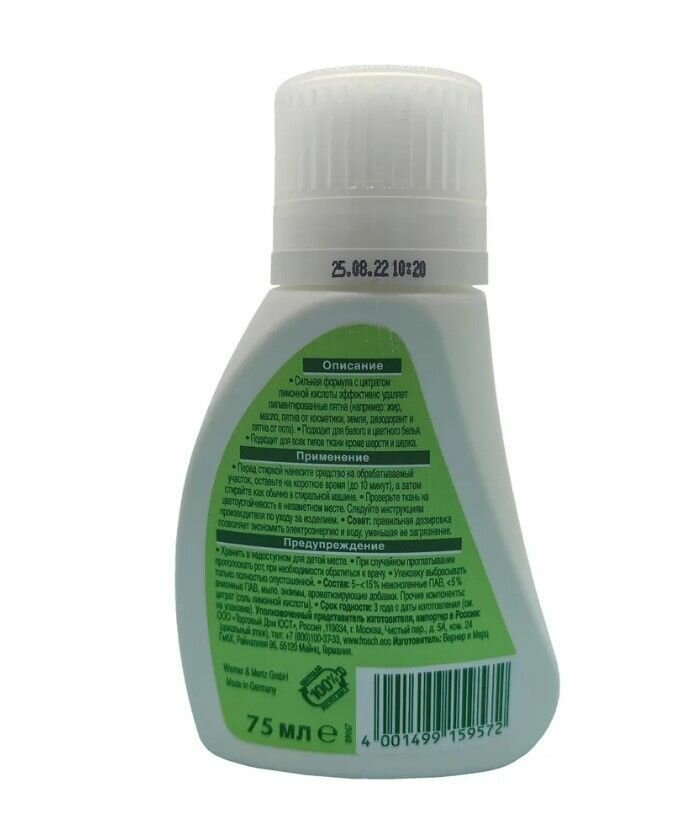 | Отзыв: | Заказываю уже не первый раз. Удобно, что наносить средство надо встроенным в горлышко бутылки поролоном. Хватает надолго. (я редко ставлю пятна на одежду))). Немецкое качество. |