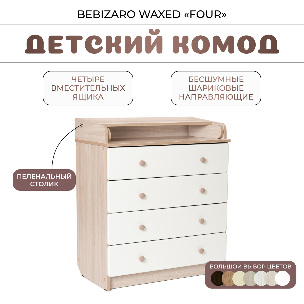 Комод пеленальный BEBIZARO WAXED "FOUR" WHITE PREMIUM
