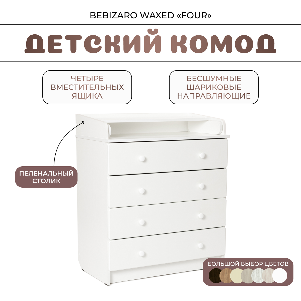Комод пеленальный BEBIZARO WAXED "FOUR" WHITE PREMIUM