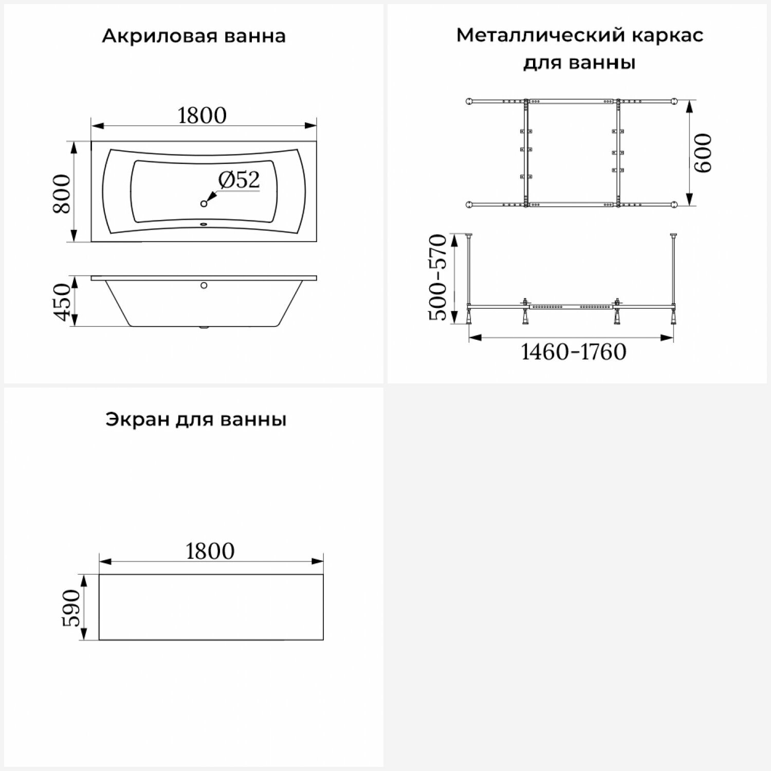 Купить Акриловая ванна 180x80 с каркасом и экраном Lavinia Boho Evan S2-37110180 в наборе 3 в 1: прямоугольная ванна 180 x 80 см, каркас, экран