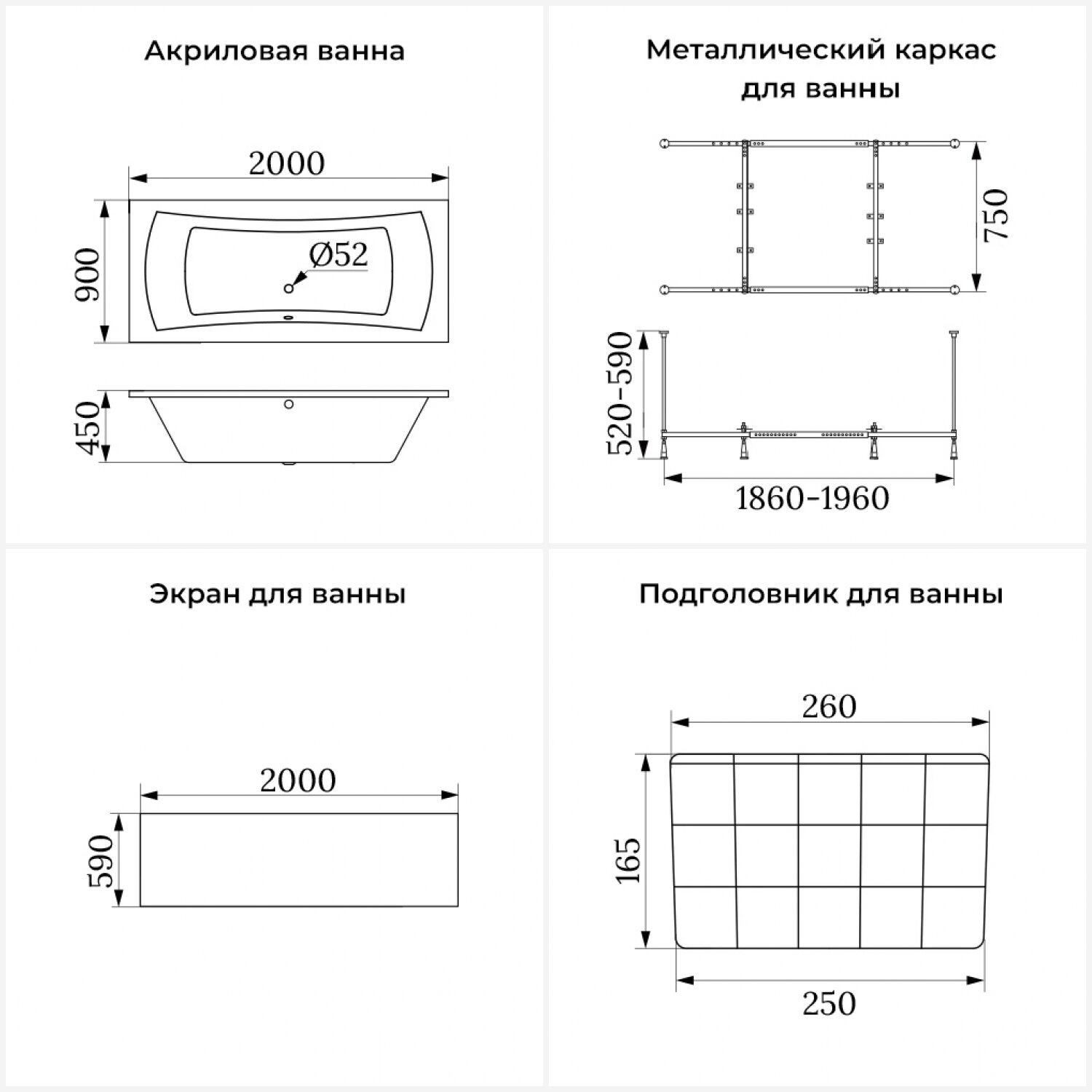 Акриловая ванна 200х90 см Lavinia Boho Evan набор 4 в 1 S2-3711020P: прямоугольная ванна, металлический каркас, подголовник, лицевой экран