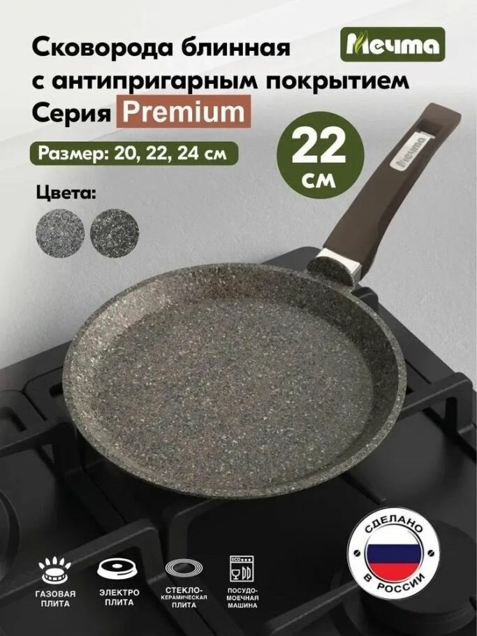 Сковорода блинная "Мечта" 22см Премиум с антипригарным покрытием с несъемной ручкой, можно мыть в посудомоечной машине
