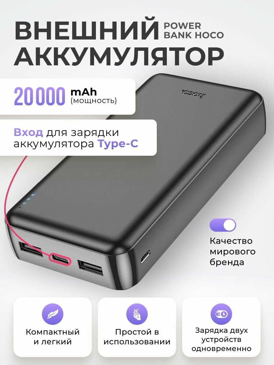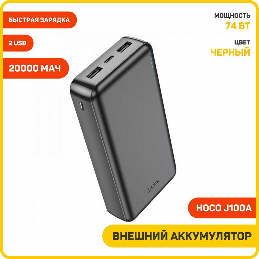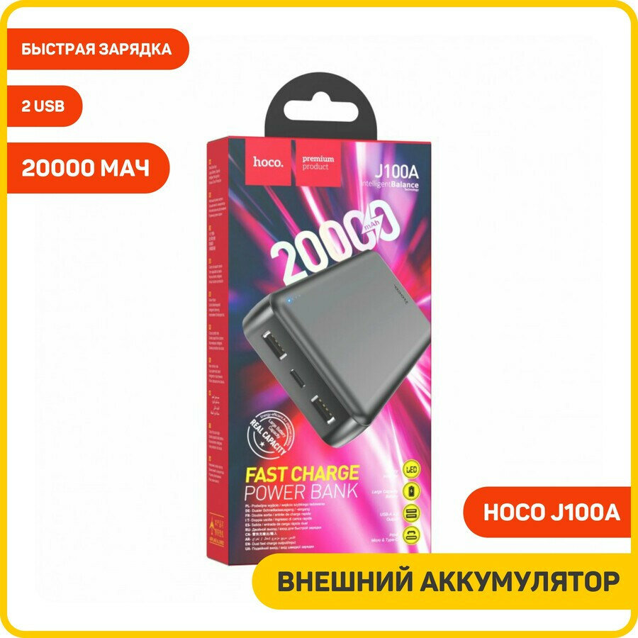 Универсальный Доп. Аккумулятор 20000mAh, J100A, HOCO, выход: 2 USB (5V/2A), черный
