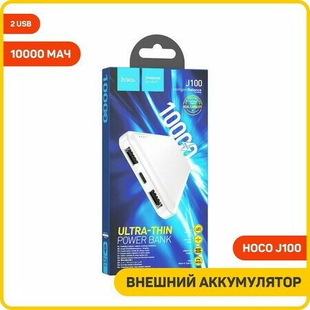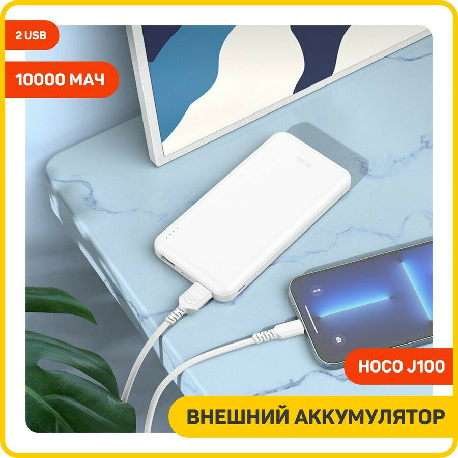 Универсальный Доп. Аккумулятор 10000mAh, J100, HOCO, выход: 2 USB (5V/2A), белый
