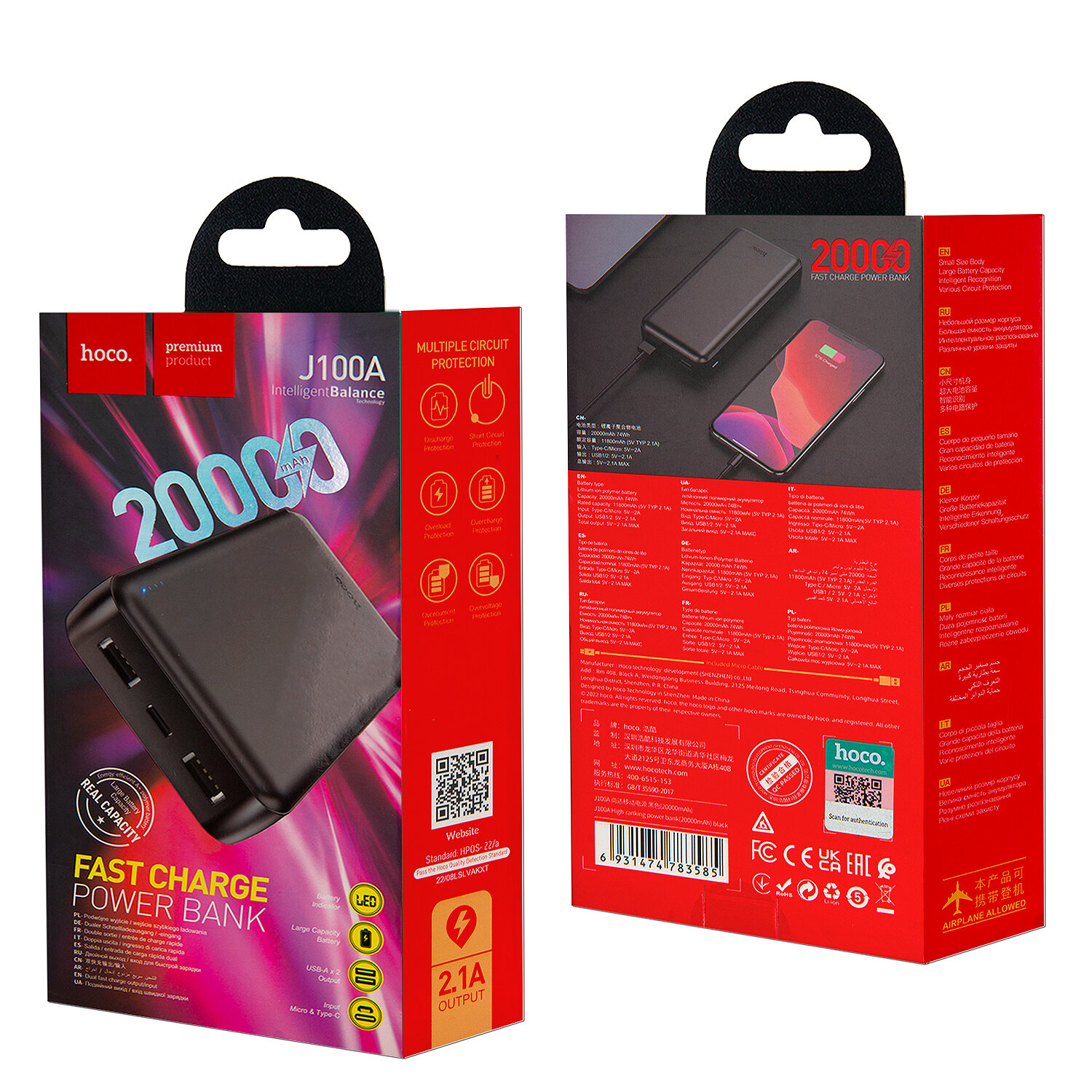 Портативный внешний аккумулятор HOCO J100A High-ranking, 2.1A, 20000 мАч, черный